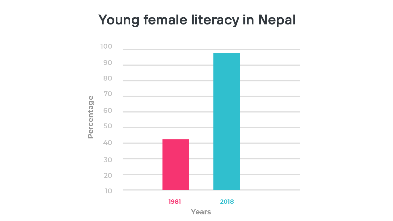 Nepal has made good progress in terms of education and literacy in the last decade itself. The adult literacy rate of Nepal grows at an average of 30.06 percent yearly (World bank, September 2018). Additionally, gender disparity in education has been swiftly decreasing, especially in the urban areas, with the percentage of literate women (15-24) years sitting at 90.88 percent. [Source]