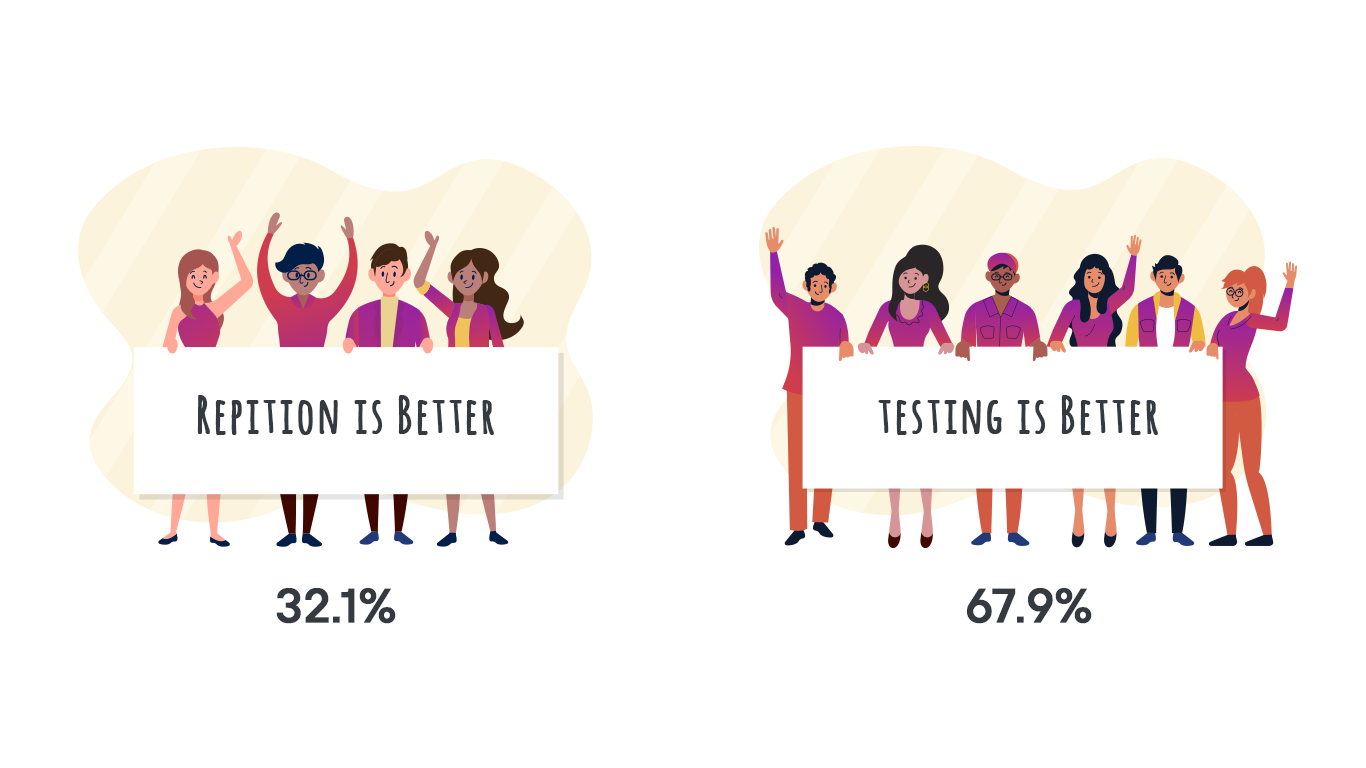 Finally, when asked to evaluate repetition and testing, 32.1 percent of teachers thought repetition was better, despite 96.4 percent believing that testing improved retention in the earlier section. This irregularity could suggest that teachers aren't a hundred percent confident about what methods to follow in class. More parameters need to be considered to cement such an observation. However, the lack of clarity suggests improper training, guidelines, and support from the government.